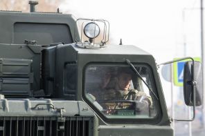 На фото: военнослужащий за рулем военного тягача МАЗ во время репетиции парада Победы.