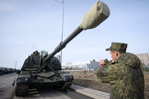 На фото: самоходная гаубица 2С19 «Мста-С» во время репетиции парада Победы.