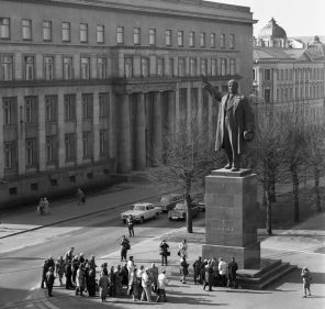 На фото: здание Совета Министров Латвийской ССР и памятник Владимиру Ильичу Ленину работы скульпторов Вениамина Яковлевича Боголюбова и Владимира Иосифовича Ингала, установленный в 1950 году на перекрестке улиц Ленина и Кирова, Рига, Латвийская ССР, СССР, 1987 год.