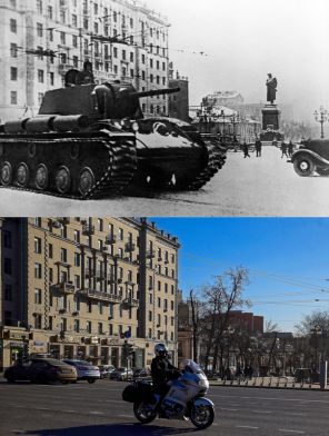 На фото сверху: танки на Пушкинской площади, 1941 год. На фото снизу: вид на магазин «Армения» на Пушкинской площади, 2015 год.