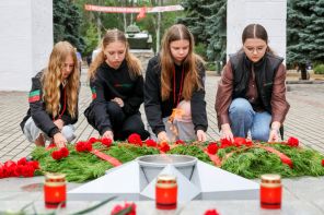 На фото: активисты молодежного движения «Юг молодой» во время торжественного возложения цветов к Вечному огню на мемориальном комплексе «Братское кладбище» в честь Дня памяти и скорби, Мелитополь, Запорожская область, Россия.