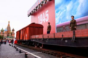 На фото: поезд Победы «Мы из Берлина» на выставке иммерсивного музея под открытым небом к 80-летию Парада Победы на Красной площади, Москва, Россия.