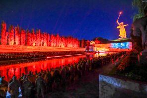 На фото: монумент «Родина-Мать зовет» во время акции «Завтра была война» в День Памяти и Скорби, Волгоград, Россия.