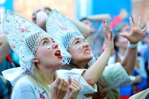 На фото: болельщицы сборной России в фан-зоне во время трансляции матча ¼ финала чемпионата мира по футболу — 2018 между сборными командами России и Хорватии, Санкт-Петербург.