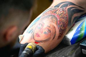 Аксессуар становится гармоничным связующим звеном между традицией и современностью. На фото: мужчина делает татуировку девушки в кокошнике, традиционном русском головном уборе, во время фестиваля татуировок в Москве, 2025 год.