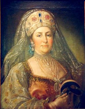 Проник кокошник и в придворный костюм. Еще Екатерина II, подчеркивая близость к русскому народу, c удовольствием позировала в нем для портретов и поощряла придворных появляться в кокошниках на маскарадах. А знаменитый русский мемуарист Филипп Вигель вспоминал, как во время Отечественной войны 1812 года многие патриотично настроенные дамы «оделись в сарафаны, надели кокошники и повязки; поглядевшись в зеркало, нашли, что наряд сей к ним очень пристал, и не скоро с ним расстались». Хотя императрица Екатерина Великая и была немкой, любить и уважать русское было частью ее государственной политики. Это, кстати, одна из причин, по которой она и стала Великой. Правило сие она выработала еще в молодости, в трудные годы будучи великой княгиней. В ее «Записках» о тех годах читаем, как она поставила себе цель «нравиться народу», а также выучить русский язык и разбираться в православных обрядах. Иллюстрация: «Портрет Екатерины II Российской (1729−1796) в старинном русском платье».