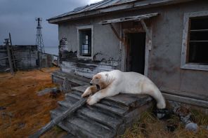 На фото: белый медведь на заброшенной исследовательской станции на острове Колючин у берегов Чукотки, сентябрь 2025 года.