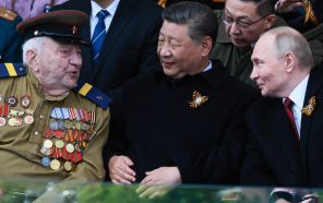 На фото: президент Российской Федерации Владимир Путин, Председатель Китайской Народной Республики Си Цзиньпин, участник Великой Отечественной войны Евгений Знаменский (справа налево) во время парада, посвященного 80-летию Победы в Великой Отечественной войне, на Красной площади.