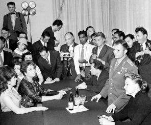 Как только в зале появился Юрий Гагарин, присутствующие стали предлагать, чтобы первый космонавт расположился с их стороны стола, делившим зал на две части. После недолгих колебаний Гагарин выбрал сторону, где находилась итальянская кинозвезда. — Юрий Алексеевич готов отвечать на ваши вопросы, — объявила Фурцева. Так началась пресс-конференция с советским космонавтом. Несмотря на то, что в протокольном мероприятии участвовали и другие зарубежные актёры, именно первой обратилась с вопросами к Гагарину Джина Лоллобриджида: — Где Вам больше нравится на Земле или в небе? — Я человек земной, мне здесь удобнее. — Что Вы чувствовали в первый момент, когда вернулись на Землю? — Что я снова стою на Земле. — Тяжело ли бремя популярности? — Очень. Так тяжело, как земной шар. — С кем бы Вы себя сравнили — с Колумбом или с Икаром? — Видите ли, по-моему, нескромно сравнивать себя с великими. Мне достаточно того, что обо мне скажет народ. — Поедете ли вы в Италию? — Обязательно. На фото: Юрий Гагарин на пресс-конференции отвечает на вопросы Джины Лоллобриджиды — итальянской актрисы, фотожурналиста, политика и общественного деятеля, одной из главных европейских секс-символов послевоенного кинематографа.