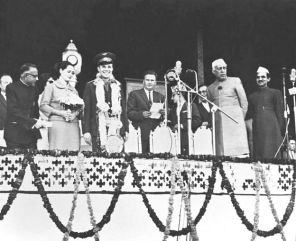На фото: премьер-министр Индии Джавахарлал Неру (второй справа на первом плане), первый человек в мировой истории, совершивший полет в космическое пространство, Герой Советского Союза, летчик-космонавт СССР Юрий Алексеевич Гагарин (третий слева на первом плане) и его супруга Валентина Ивановна на празднике в честь первого космонавта, 1961 год. В Индии, куда Гагарин отправился с женой Валентиной, официальная программа была столь напряженной, что Гагарин под конец визита посетовал: «Все хорошо, только программа очень перегружена. Много политики и почти ничего для себя, даже слонов в Индии не видели».