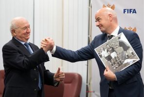 На фото: первый вице-президент РФС Никита Симонян и президент Международной федерации футбола (ФИФА) Джанни Инфантино (слева направо) во время пресс-конференции, 2016 год.
