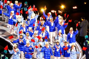На фото: олимпийская команда Китая во время церемонии открытия на олимпийском стадионе «Сан-Сиро». Мужчины в ярко-синих пуховиках, женщины — в светло-голубых.