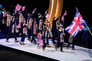 На фото: олимпийская команда Великобритании во время церемонии открытия на олимпийском стадионе «Сан-Сиро», состоящая из 53 мужчин и женщин, в костюмах от Ben Sherman. Главными элементами одежды здесь являются большие шарфы с надписью «ВЕЛИКОБРИТАНИЯ». Принцесса Анна и ее муж улыбаются — не ухмыляются — с трибун, в таких же шарфах. Маленькая Лила Фир несет флаг.