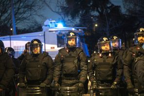 На фото: карабинеры во время антиолимпийского факельного шествия в Милане.
