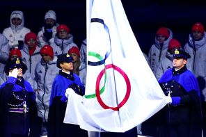 На фото: поднятие олимпийского флага во время церемонии открытия на олимпийском стадионе «Сан-Сиро».