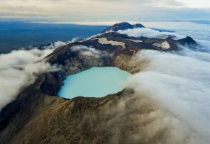 На фото: действующий стратовулкан Малый Семячик. Последнее извержение произошло 1952 году, в результате чего в кратере вулкана образовалось озеро Троицкое с высокой концентрацией кислоты и серы. Камчатский край. Необычный камчатский вулкан имеет три конуса, слившихся в трёхкилометровый хребет. В одном кратере — озеро бирюзово‑зелёного цвета, появившееся после извержения.