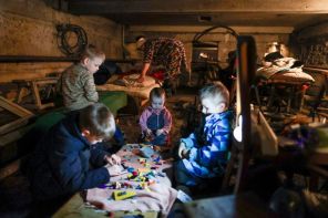 На фото: местные жители в бомбоубежище в подвале дома на улице Богуна в Горловке.