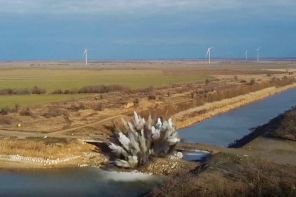 Украина. Херсонская область. Во время расчистки русла Северо-Крымского канала (на фото). Вооруженные Силы РФ освободили от националистических вооруженных формирований Украины и взяли под охрану гидротехнический узел Северо-Крымского канала. В соответствии с решением Министра обороны РФ Сергея Шойгу в целях устранения водной блокады Крымского полуострова специалисты Минобороны России приступили к проведению работ по очистке русла и восстановлению инфраструктуры гидротехнических сооружений канала.