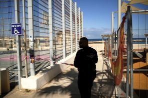 На фото: полицейский на пляже после срабатывания сигнала тревоги о начале израильской атаки на Иран, Хайфа, Израиль.