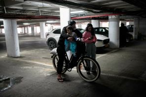 На фото: супружеская пара с ребенком стоят в многоуровневой парковке, используемой в качестве укрытия, после того, как зазвучали сирены, сигнализирующие о приближении израильских ракет к Ирану, Тель-Авив, Израиль.