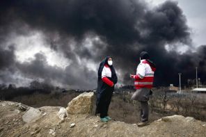 На фото: женщины из Иранского Красного Полумесяца стоят на фоне густого столба дыма от американо-израильского удара по нефтехранилищу, Тегеран, Иран.