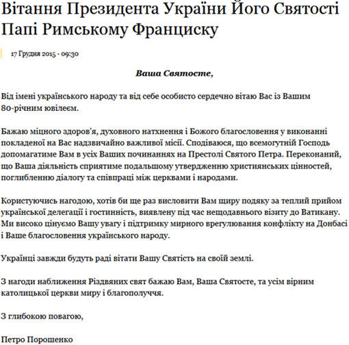 «Мы высоко ценим ваше внимание и поддержку мирного урегулирования конфликта на Донбассе и ваше благословение украинского народа. Украинцы всегда будут рады приветствовать Ваше Святейшество на своей земле», — говорится в поздравлении Порошенко, размещенном на сайте украинского президента.