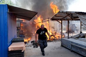 На фото: пожар на Майском рынке в Буденновском районе после попадании на его территорию снарядов, выпущенных Вооруженными силами Украины (ВСУ). В результате обстрела погибли люди, Донецк