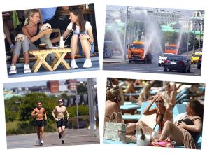 Жара в Москве. В Москве сохраняется жаркая погода. Небольшое похолодание, по прогнозам синоптиков, возможно лишь во второй половине следующей недели. В связи с этим горожанам было рекомендовано меньше времени проводить на солнце. Врачи советовали пить больше воды, носить головные уборы и светлую одежду из легких натуральных тканей, использовать солнцезащитные средства. С пятницы, 8 июля, жара в Москве пойдет на спад. Температура будет держаться около вполне комфортных +24…+26°С. Однако передышка окажется недолгой, предупредил научный руководитель Гидрометцентра РФ Роман Вильфанд. Уже в воскресенье, 10 июля, температура воздуха составит +27…+29°С.