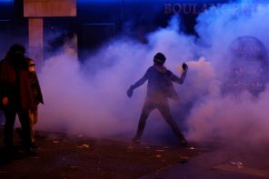 На фото: во время столкновения во время демонстрации против насилия со стороны полиции в Нанте, западная Франция. Президент Франции Эммануэль Макрон в четверг, 30 марта 2023 года, обнародовал обширный план по обеспечению суверенитета Франции над своими водными ресурсами. Его речь прозвучала после ожесточенных сражений на поле в сельской местности между силами безопасности и воинствующими экологами, выступающими против строительства водохранилища на западе Франции, которые потрясли нацию, превратив пасторальную сельскую местность в то, что выглядело как зона боевых действий.