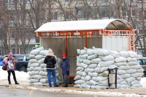 Обеспечение безопасности на улицах Белгорода. На фото: горожане около укрепления из мешков с песком на автобусной остановке.