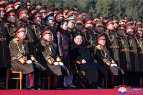 На снимке, предоставленном правительством Северной Кореи, лидер КНДР Ким Чен Ын (на первом плане второй справа) и его дочь во время совместной фотосессии с офицерами министерства обороны на праздновании 76-й годовщины основания Корейской народной армии (КНА), Пхеньян, КНДР.