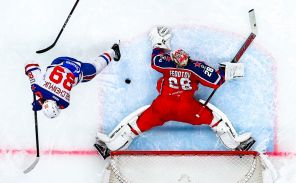 Москва. Стадион «ЦСКА-Арена». Континентальная хоккейная лига. ЦСКА (Москва) — СКА (Санкт-Петербург). На фото: вратарь Иван Федотов (ЦСКА) и Алекс Гальченюк (СКА) во время матча.