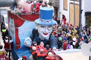 На фото: платформа Frontex и лодка беженцев принимают участие в параде Розового понедельника во время карнавала в Кельне. Девиз сезона Кёльнского карнавала 2024 года — «Wat e Theater — wat e Jeckespill» (Какой театр — такая шутка).