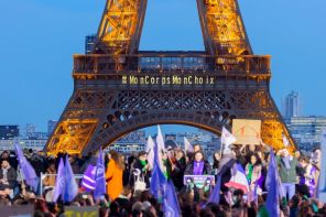На фото: толпы людей собрались у Эйфелевой башни во время массовых торжеств во время прямой трансляции парламентского голосования за закрепление добровольного прерывания беременности в Конституции. Конгресс Франции проголосовал за включение свободы абортов в конституцию страны в попытке защитить закон, который декриминализовал аборты во Франции в 1975 году (IVG).