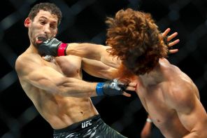 На фото: российские бойцы Армен Петросян и Шарабутдин (Шара) Магомедов (слева направо) во время поединка в среднем весе на турнире по смешанным единоборствам Абсолютного бойцовского чемпионата (UFC) 308. Бой завершился победой Шарабутдина Магомедова, Абу-Даби, Объединенные Арабские Эмираты, октябрь 2024.