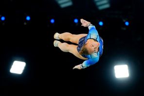 На фото: Анжела Бладцева (Россия) во время соревнований на Олимпиаде-2024 в Париже. Прыжки на батуте. Женщины. Квалификация.