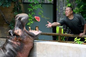 На фото: кормление бегемота замороженным арбузом в Шэньянском лесном диком зоологическом саду в жаркий июльский день, Шэньян, провинция Ляонин, Китай.