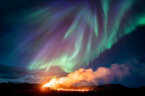 На фото: вид на зону извержения с танцующим в небе северным сиянием недалеко от города Гриндавик, Исландия, апрель 2024 года. Вулкан на юго-западе Исландии, который извергался трижды в декабре, январе и феврале, посылая лаву в сторону близлежащего населенного пункта, продолжает извергаться.