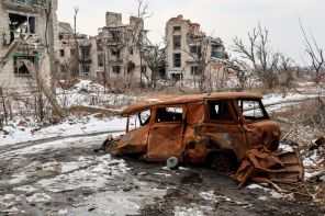 На фото: вид на ржавый автомобиль и разрушенные здания, поселок Пески, ДНР, Россия.