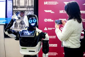 На фото: робот Promobot на ежегодном международном научно-технологическом форуме «Робототехника, интеллект машин и механизмов» на территории Финансового университета при правительстве РФ.