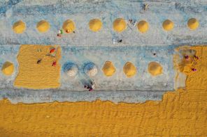 На фото: сотни тысяч зерен риса переворачивают для сушки под жарким солнцем в Богре, Бангладеш. Фермеры используют метлы, чтобы сгребать рис в линии и узоры, так что зерна вращаются под солнечным светом, пока не останется влаги. Сушка снижает уровень влажности зерна до безопасного уровня, пригодного для хранения. Когда рис собирают, он содержит 20%-30% влаги, а высокая влажность в зерне может уничтожить всю партию или способствовать развитию плесени, а также увеличить вероятность нападения вредителей. Фермеры проводят часы на палящем солнце, перебирая рис ногами, чтобы он равномерно высох.