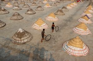 Когда собирают рис, он содержит 20−30% влаги, и эта влага, как и повреждение вредителями, может уничтожить весь урожай зерен. Поэтому важно, чтобы рисовое зерно высохло в течение 24 часов после сбора с поля. На фото: высушенный рис хранится под гигантскими бамбуковыми конусами в форме шляпы.
