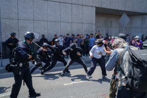 На фото: сотрудники полиции Лос-Анджелеса избивают протестующих дубинками.