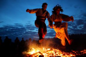На фото: люди в традиционной русской деревенской одежде празднуют летнее солнцестояние у костра в деревне Окунево, примерно в 200 километрах (125 милях) к северо-востоку от сибирского города Омск, Россия.