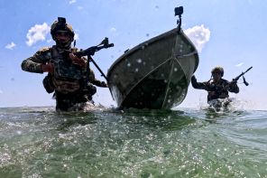 На фото: военнослужащие штурмового подразделения группировки войск «Днепр» во время тренировки на водном полигоне в тыловой зоне СВО, Херсонская область, Россия.