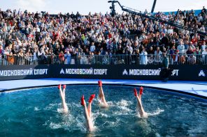 На фото: показательное выступление команды по синхронному плаванию в рамках фестиваля водных видов спорта «Две реки» в парке «Музеон» на Крымской набережной, Москва, Россия.