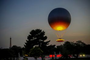 На фото: воздушный шар с олимпийским огнем, спроектированный французским дизайнером Матье Леаннером, установлен в саду Тюильри, Париж., Франция. Шар будет парить в небе над Парижем с 21 июня по 14 сентября.