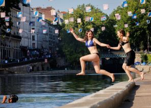 На фото: молодёжь ныряет в канал Сен-Мартен, Париж, Франция. В 84-х департаментах объявлен «оранжевый уровень опасности из-за сильной жары». В некоторых районах температура превысила 40 градусов Цельсия.