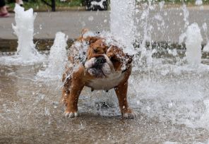 На фото: Элси, британский бульдог, охлаждается в жаркую погоду в фонтане на Рассел-сквер в Лондоне, Великобритания.