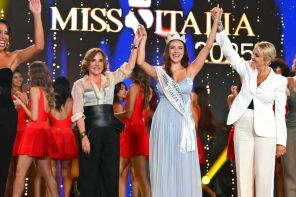 На фото: победительница конкурса красоты «Мисс Италия 2025» Катя Бучиккио, организатор конкурса Патриция Мирильяни (вторая слева) и модель Франческа Паскале (справа), Порто-Сан-Джорджо, Италия.